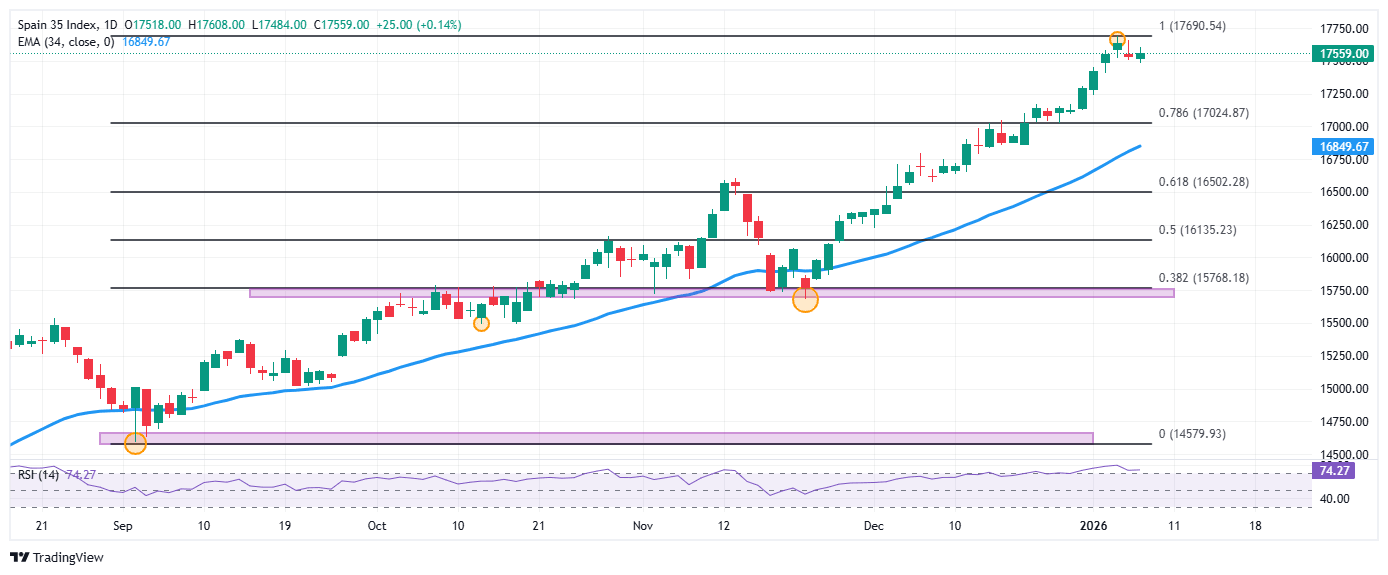 El Ibex 35 reaccionó al alza desde mínimos del 5 de enero en 17.484, donde atrajo compradores que llevaron el índice a un máximo del día en 17.608. Actualmente, el Ibex 35 opera en 17.553, subiendo un 0.14% diario.