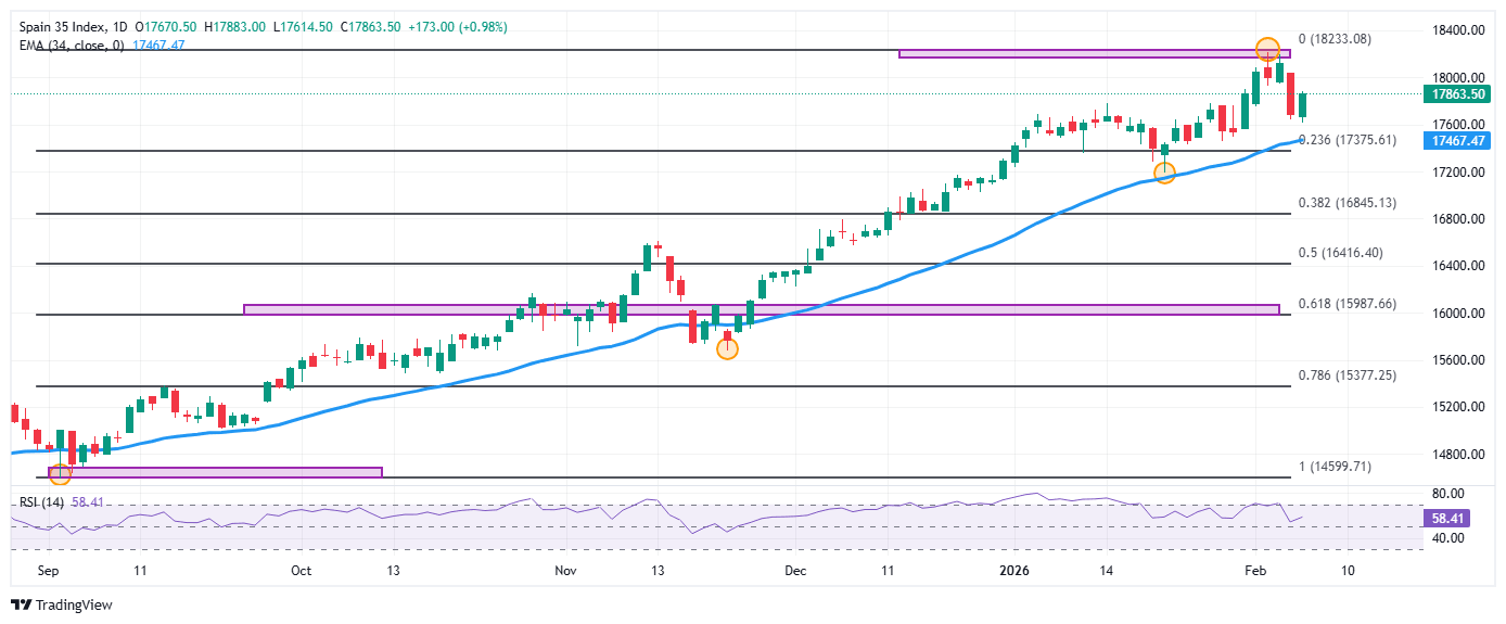 El Ibex 35 reaccionó al alza desde mínimos del 30 de enero en 17.614, atrayendo compradores que llevaron el índice a un máximo del día en 17.883. En estos momentos, el Ibex 35 opera sobre 17.864, ganando un 0.9% en el día.