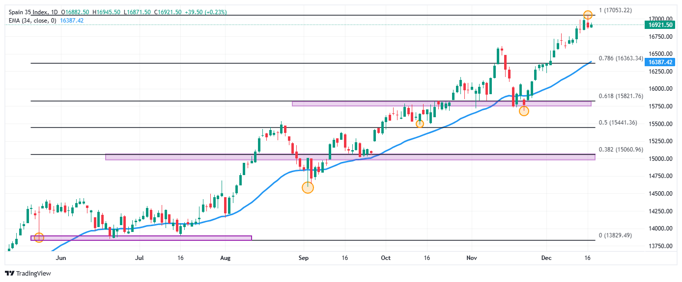 El Ibex 35 reaccionó al alza desde un soporte de corto plazo en 15.682, mínimo del 21 de noviembre. El siguiente soporte importante se encuentra en 15.488, punto pivote del 14 de octubre. Al alza, proyectamos una posible toma de ganancias en 17.500, número cerrado que converge con la extensión al 127.2% de Fibonacci.