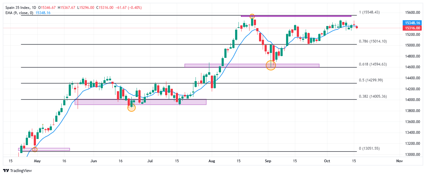 El Ibex 35 estableció un soporte de corto plazo en 15.018, mínimo del 22 de septiembre. El siguiente soporte clave lo observamos en 14.591, punto pivote del 2 de septiembre en confluencia con el retroceso al 61.8% de Fibonacci. Al norte, la resistencia más cercana está en 15.538, máximo del 22 de agosto.