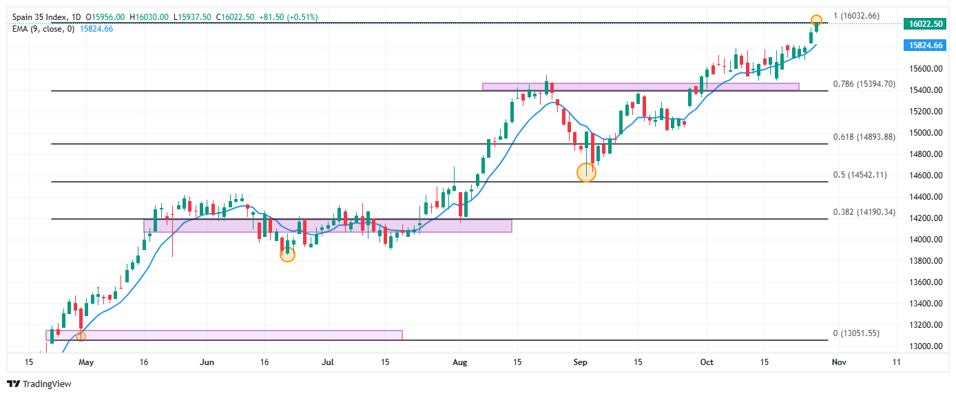 El Ibex 35 estableció un mínimo diario en 15.937, atrayendo compradores que impulsaron el índice a máximos no visto desde el 9 de noviembre de 2017 en 16.030. Actualmente, el Ibex 35 opera sobre 16.026, subiendo un 0.53%.