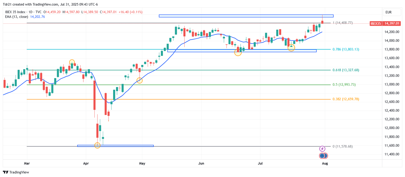 El Ibex 35 Marcó un mínimo del día en 14.395, donde atrajo compradores agresivos que impulsaron el índice a máximos no vistos desde el 10 de enero de 2008 en 14.597. Al momento de escribir, el Ibex 35 cotiza en 14.397, avanzando un 0.12% en el día.