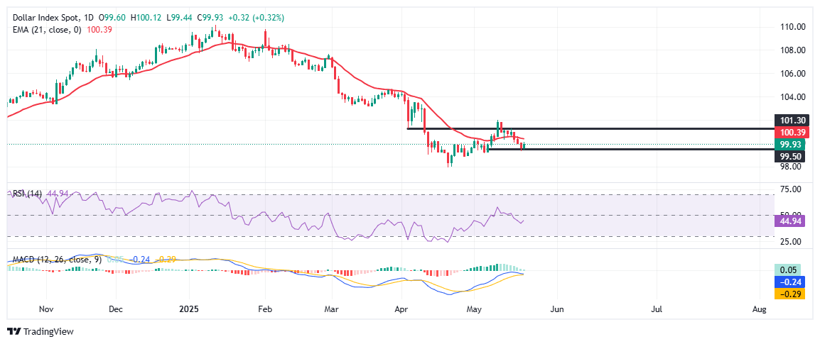 El índice del Dólar estadounidense (DXY), que rastrea el Dólar estadounidense (USD) frente a una cesta de seis principales divisas, se está negociando con cautela alrededor de la marca de 100.00 el jueves tras recuperarse de un mínimo de dos semanas y rebotar en el soporte clave del nivel psicológico de 99.50 a primera hora del día. Mientras el Dólar muestra signos de resiliencia, el potencial alcista sigue limitado ya que el sentimiento de riesgo más amplio permanece frágil en medio de la creciente incertidumbre fiscal en los Estados Unidos (EE.UU.).