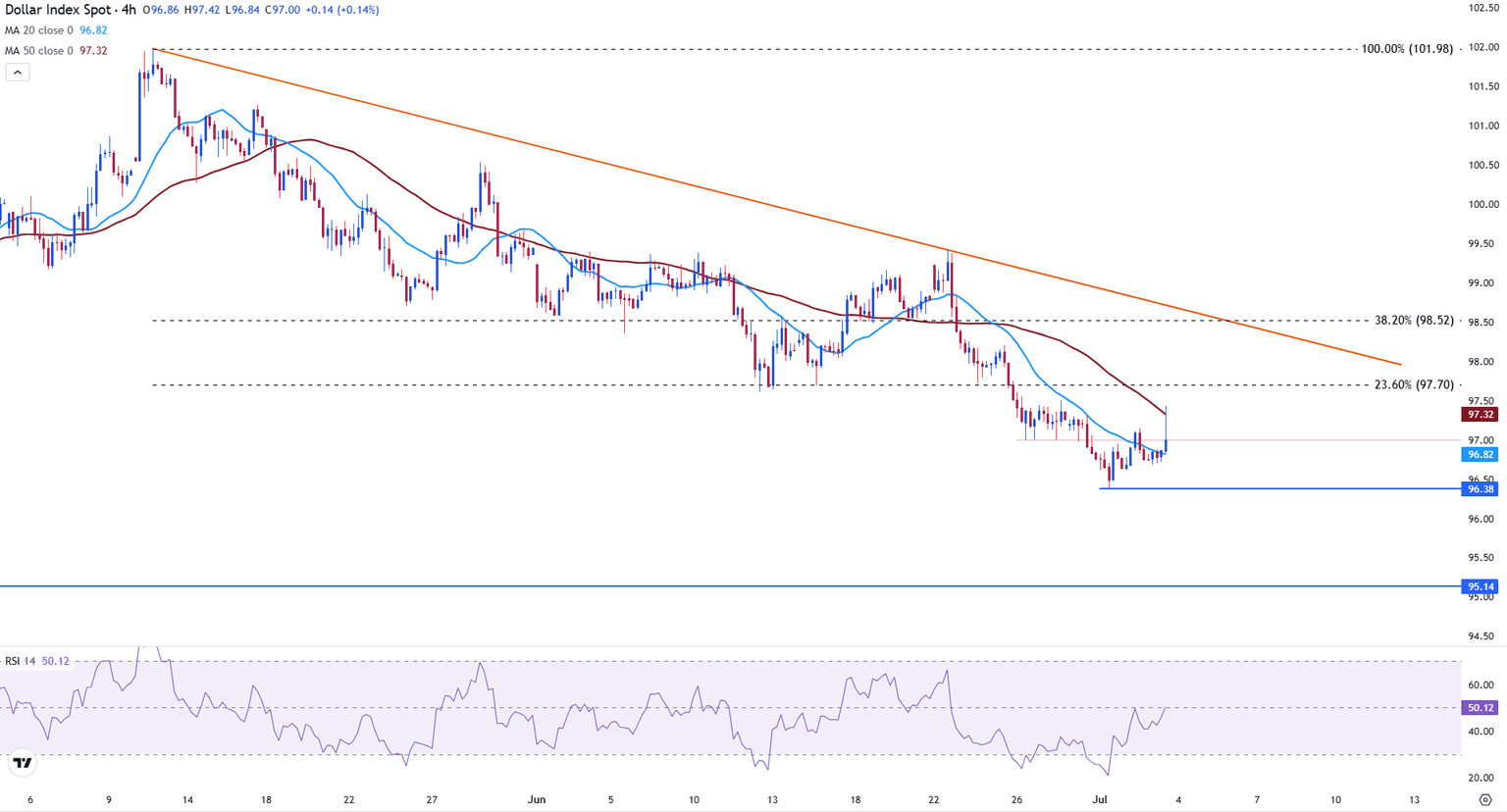 El DXY salta por encima de 97.00, antes de estabilizarse con el RSI retrocediendo a territorio neutral