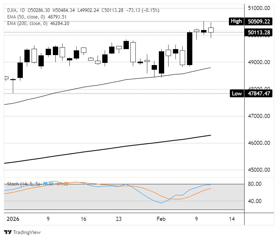 El Promedio Industrial Dow Jones (DJIA) devolvió ganancias tempranas el miércoles, perdiendo alrededor de 120 puntos para cerrar con una caída de aproximadamente 0.2% cerca de 50.010 después de recuperar brevemente el nivel de 50.000 en las primeras operaciones. El S&P 500 cayó un 0.2% mientras que el Nasdaq Composite bajó un 0.5%, arrastrado a la baja por otra ola de ventas en nombres de software empresarial. Los mercados inicialmente repuntaron tras un informe de Nóminas No Agrícolas (NFP) de enero mucho más fuerte de lo esperado, pero el entusiasmo se desvaneció a medida que los inversores digerían los comentarios de línea dura de la Reserva Federal (Fed) y las renovadas preocupaciones de que las herramientas de inteligencia artificial están afectando los modelos de negocio de software tradicionales.
