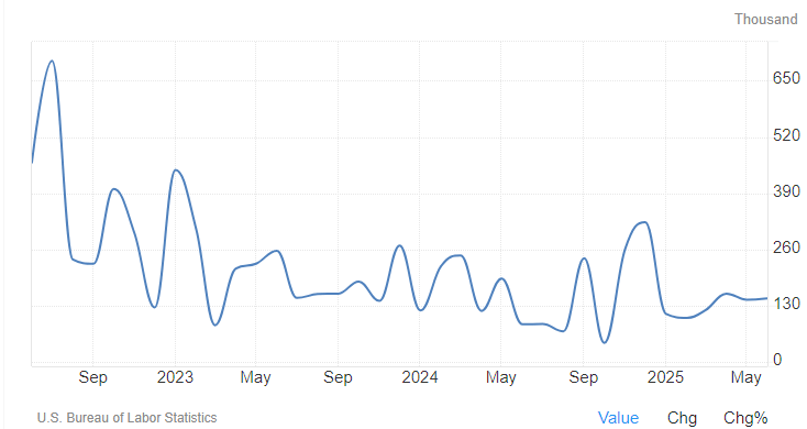 Las cifras del NFP de EE.UU. mostraron una ganancia neta de 147.000 nuevos empleos hasta junio, superando la previsión mediana del mercado de 110.000. La cifra del mes anterior también fue revisada al alza a 144.000, poniendo fin funcionalmente a los temores de crecimiento laboral estancado en el mercado amplio de esta semana. Sin embargo, no todo es tan optimista como parece en los titulares: alrededor de la mitad de todas las ganancias de empleo registradas en junio provino de contrataciones en el gobierno estatal y local (+73.000), seguidas de cerca por más ganancias de empleo en servicios de salud (+58,6K), con contrataciones en ocio y hospitalidad en tercer lugar (+20.000). Con la mayoría de las contrataciones gubernamentales ocurriendo en el sector educativo, los analistas están lanzando señales de advertencia tempranas de que es increíblemente poco probable que los gobiernos estatales y locales puedan mantener este ritmo de creación de empleo.