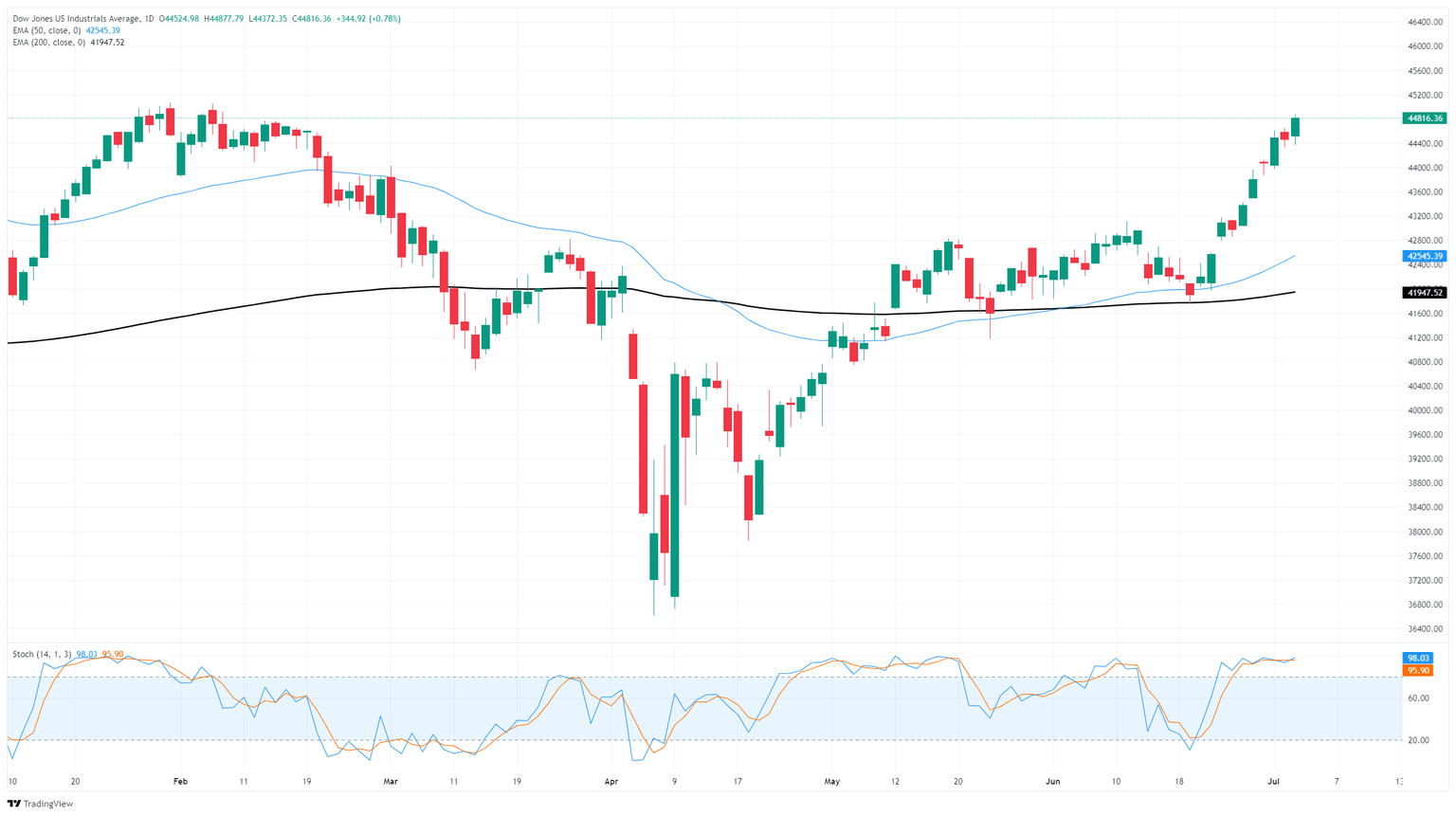 Junio apenas ha comenzado, y el Promedio Industrial Dow Jones ya está en camino de registrar un tercer mes consecutivo de ganancias. El Dow Jones ha subido más del 22% desde sus mínimos tras el anuncio de aranceles cerca de 36.600, probando la región de 44.800 y en camino de volver a desafiar los máximos históricos justo por encima de 45.000.