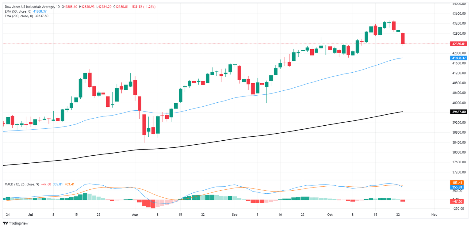 El Promedio Industrial Dow Jones (DJIA) está listo para lidiar con una semana de pérdidas, algo que el principal índice bursátil no ha tenido que hacer desde agosto. El Dow se volvió más bajista el miércoles, cayendo más de 550 puntos en su pico y perdiendo más del 1,3% desde las ofertas de apertura del día. El DJIA terminó el miércoles 400 puntos más abajo, perdiendo casi un punto porcentual completo durante el día después de una recuperación escasa desde los mínimos del día.