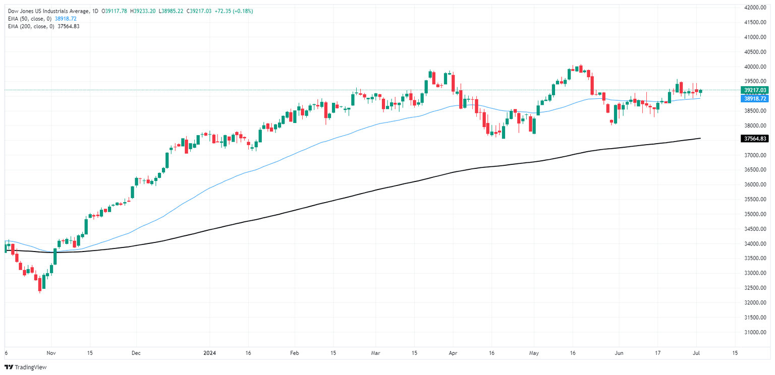 El Dow Jones se mantiene en el lado bajo de los máximos históricos establecidos justo por encima de la zona de precio principal de 40.000,00 en mayo, y una lenta recuperación desde el último mínimo importante en 38.000,00 amenaza con quedarse sin impulso.
