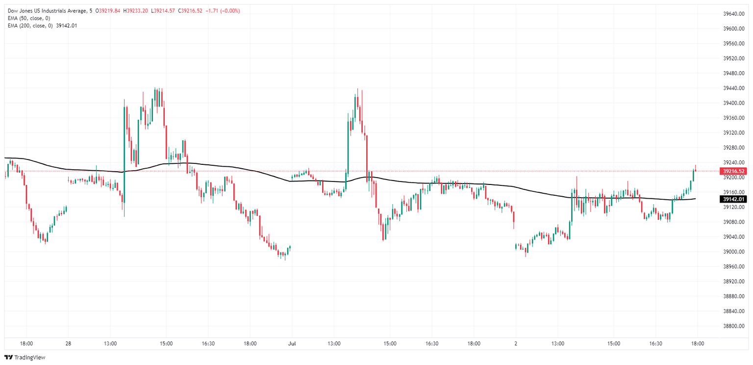 Un movimiento lateral ha plagado al índice Dow Jones desde que volvió a territorio de gráficos entre 39.500,00 y la zona de 39.000,00. Un techo técnico a corto plazo está fijado en el último máximo en 39.581,00, con la media móvil exponencial (EMA) de 50 días proporcionando un suelo de precio intradía desde 38.918,00.