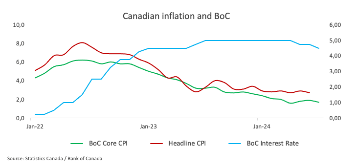 Junto con los datos del IPC, el Banco de Canadá (BoC) también dará a conocer su índice de precios al consumo subyacente, que excluye componentes volátiles como los alimentos y la energía. En junio, el IPC subyacente del BoC registró una caída del 0,1% en comparación con la lectura de mayo y un aumento del 1,9% en los últimos doce meses, mientras que el IPC general subió un 2,7% en el último año y se contrajo un 0,1% respecto al mes anterior.