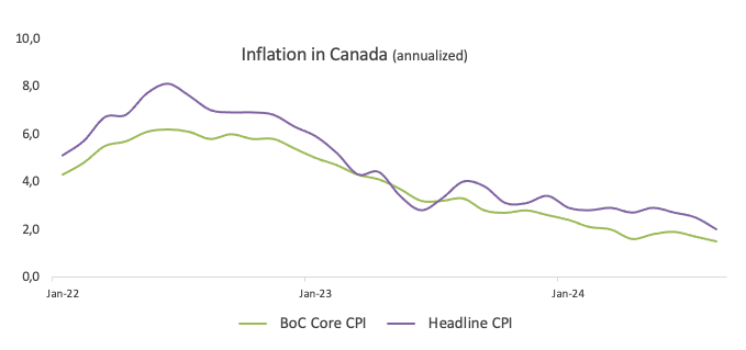 - El Banco de Canadá ha reducido su tasa de política en 75 puntos básicos en lo que va del año.