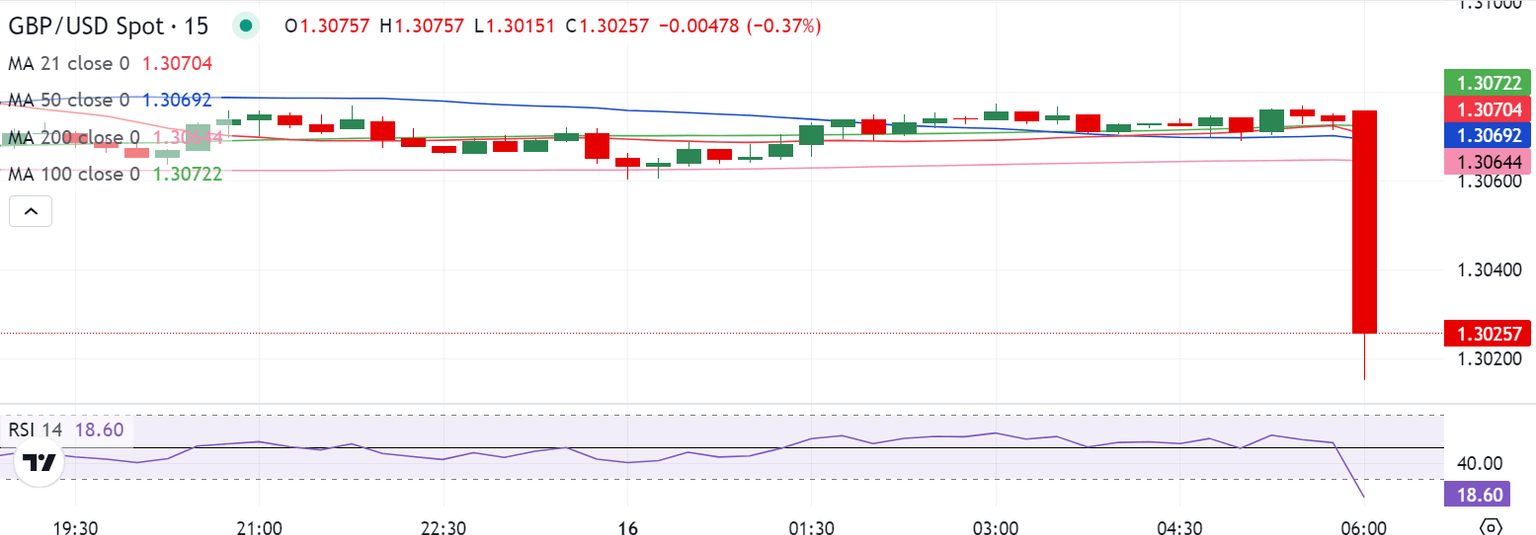 Los datos del IPC del Reino Unido golpean a la Libra esterlina, ya que el par GBP/USD cae de nuevo hacia 1.3000. El par cotiza un 0,40% más bajo en el día cerca de 1.3015, en el momento de escribir.