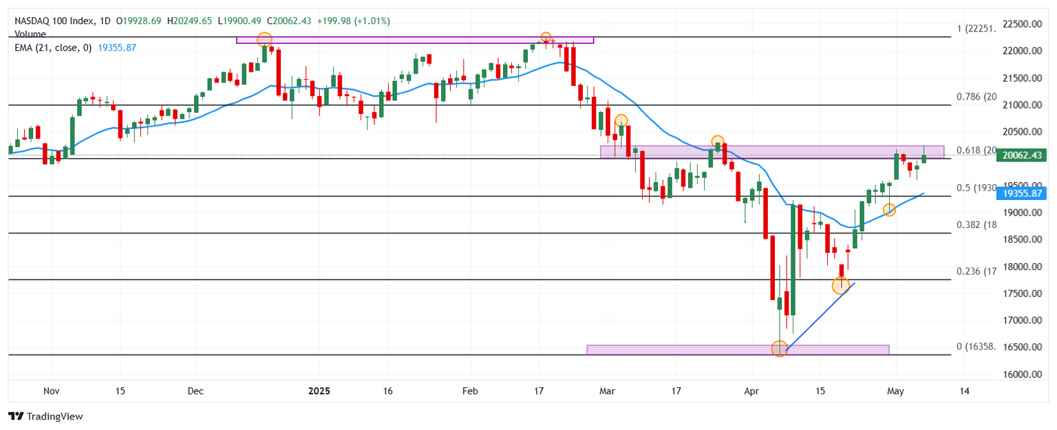 El Nasdaq 100 marcó un mínimo del día en 19.900, atrayendo compradores agresivos que llevaron el índice a máximos no vistos desde el 26 de marzo en 20.249. Actualmente, el Nasdaq 100 opera en 20.062, subiendo un 1.01% en la jornada del jueves.