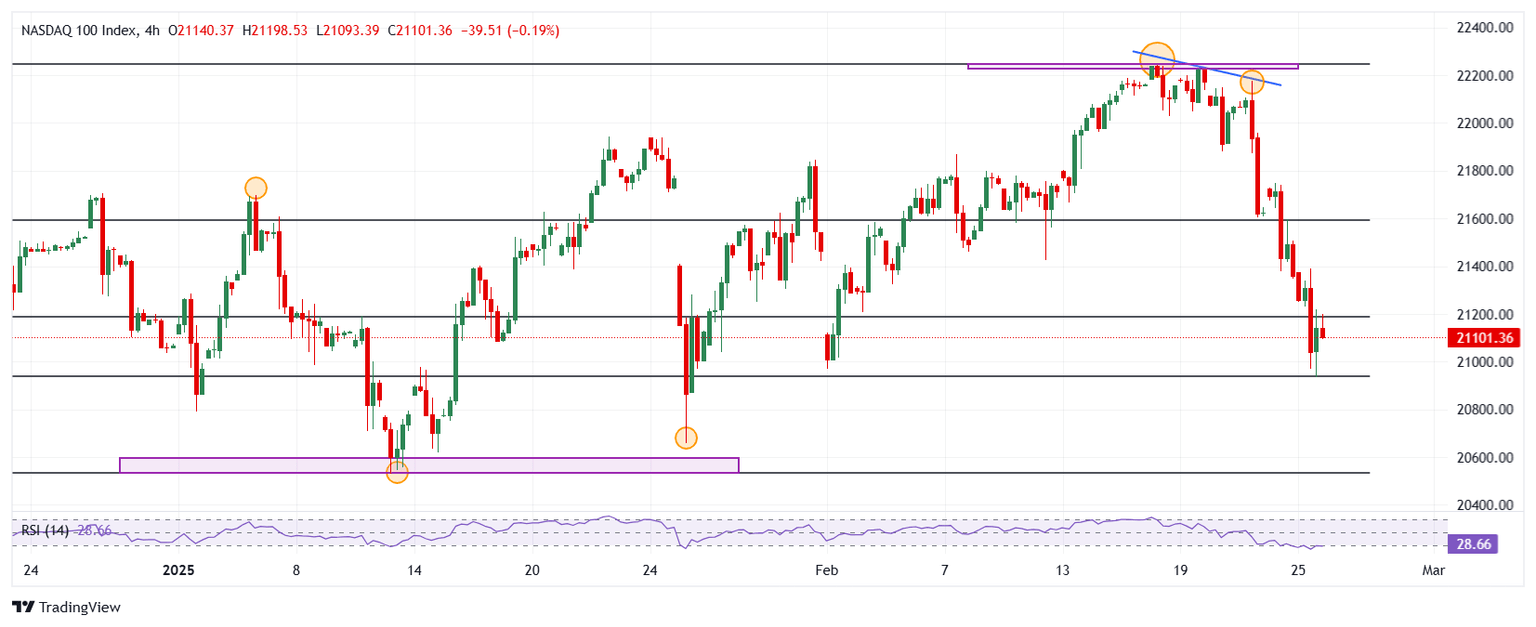 En este contexto, el Nasdaq 100 retrocede un 1.16% en la jornada del martes, visitando mínimos no vistos desde el 27 de enero en 20.935, teniendo en la mira el soporte clave del 13 de enero ubicado en 20.530.