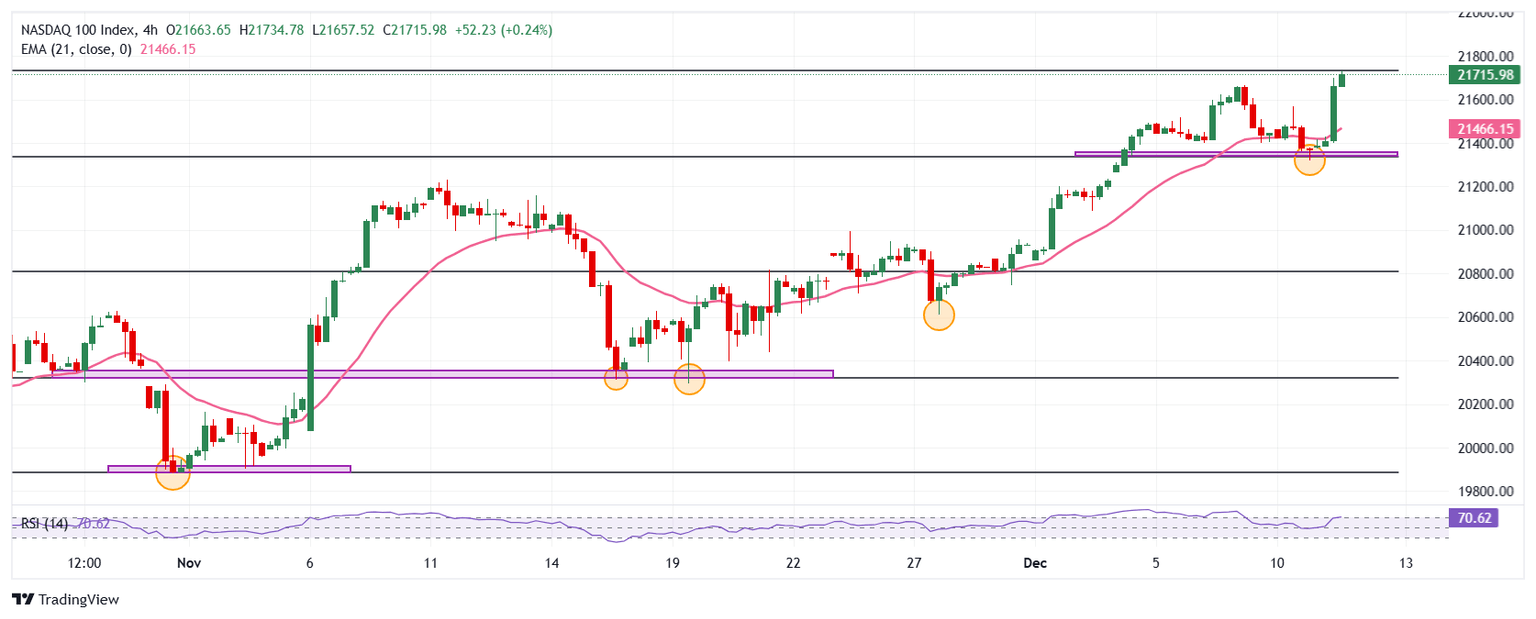El índice tecnológico Nasdaq 100 repunta un 1.70% en la jornada del miércoles, alcanzando nuevos máximos históricos en 21.736.