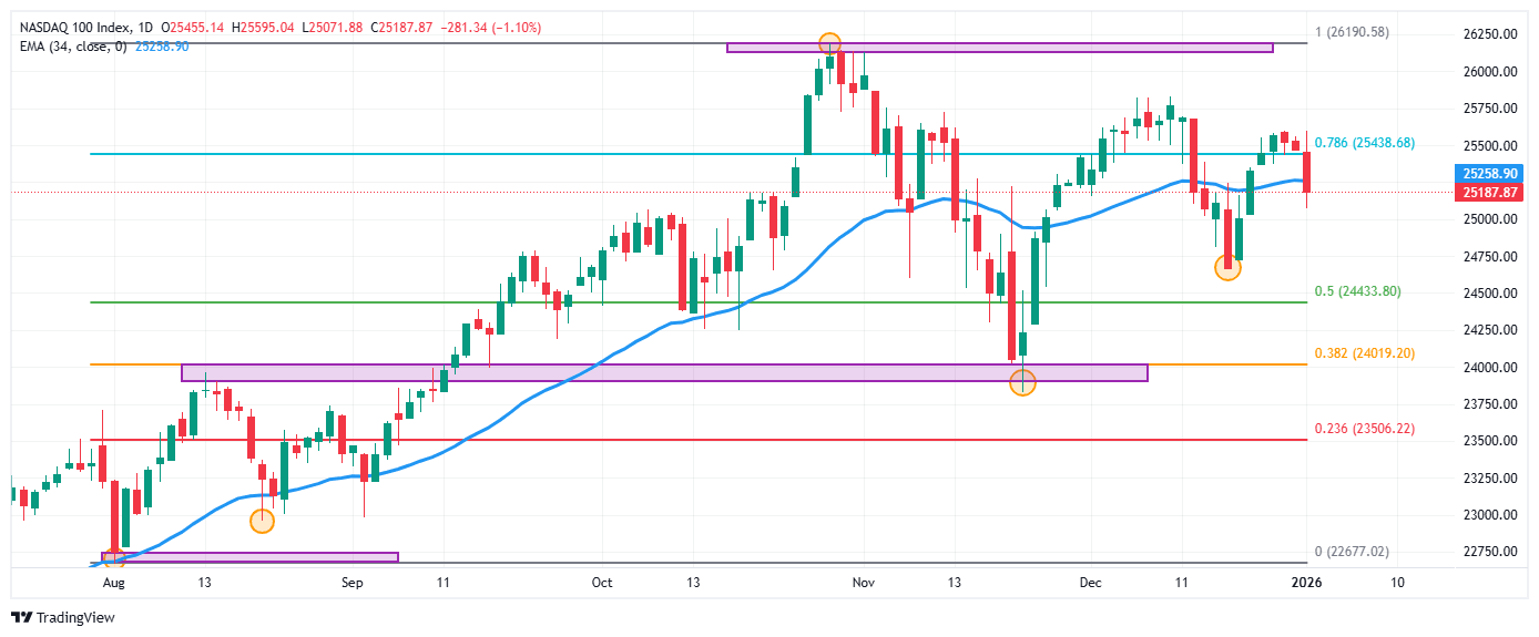 El Nasdaq 100 reaccionó a la baja desde máximos del 29 de diciembre en 25.595, encontrando vendedores agresivos que llevaron el índice a mínimos de cinco sesiones en 25.071. En estos momentos, el Nasdaq 100 se negocia en 25.187, cayendo un 1.10%.