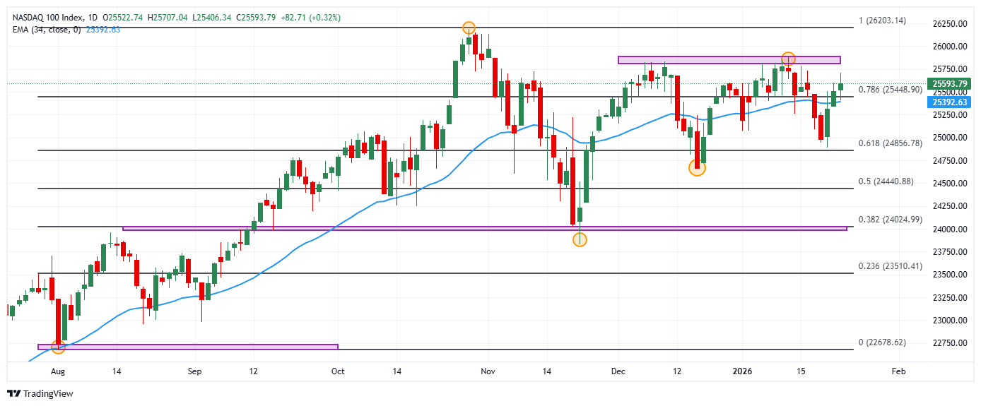 En este contexto, el Nasdaq 100 gana 82 puntos, llegando a máximos del 16 de enero en 25.707.