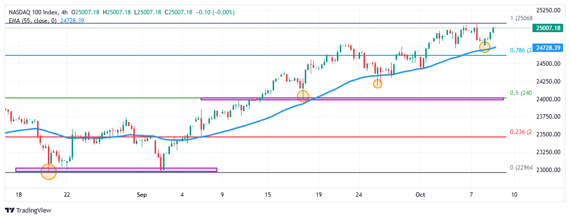 El Nasdaq 100 registro un mínimo del día en 247.64, atrayendo compradores agresivos que llevaron el índice a un máximo diario en 25.019. Actualmente, el Nasdaq 100 opera en 25.007, ganando un 0.70% el día de hoy .
