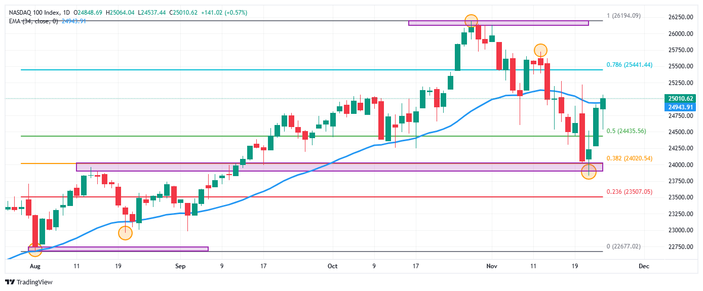 - El Nasdaq 100 sube un 0.57% en la jornada del martes, llegando a máximos del 20 de noviembre en 25.064.