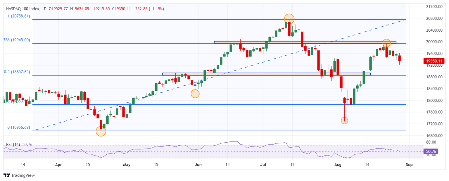 El Nasdaq 100 estableció un máximo del día en 19.624, atrayendo vendedores que llevaron el índice a un mínimo no visto desde el 15 de agosto. Al concluir la jornada, el Nasdaq 100 cotiza en 19.350, perdiendo un 1.19%.