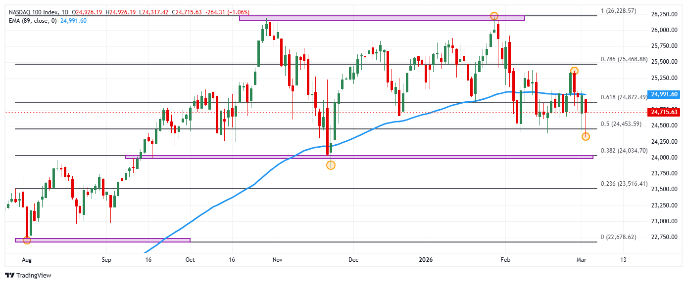 - El Nasdaq 100 se desliza un 1.06% diario, alcanzando mínimos no vistos desde el 24 de noviembre de 2025 en 24.317.