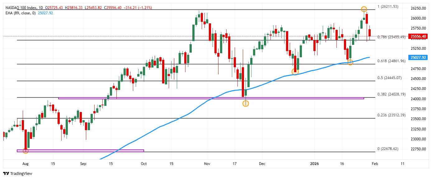 - El Nasdaq 100 retrocede un 1.25% diario, llegando a un mínimo del día en 25.453.