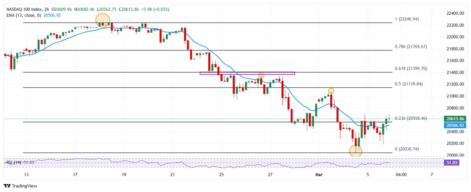 El Nasdaq 100 marcó un mínimo del día en 20.182, atrayendo a compradores agresivos que impulsaron el índice a un máximo diario en 20.682. Al momento de escribir, el Nasdaq 100 opera sobre 20.682, ganando un 1.30% en el día.