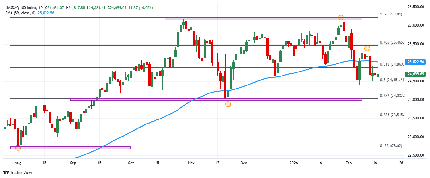 El Nasdaq 100 reaccionó al alza desde mínimos no vistos desde el 24 de noviembre en 24.384. En estos momentos, el Nasdaq 100 se negocia en 24.698, avanzando un 0.05% en la segunda jornada de la semana.