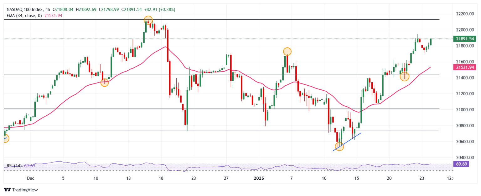 El Nasdaq 100 reaccionó al alza en un soporte de corto plazo dado por el mínimo del 21 de enero en 21.384, en confluencia con el retroceso al 61.8% de Fibonacci. La siguiente zona clave de soporte está en 20.532, punto pivote del 13 de enero. Al alza, la resistencia importante está en 22.131, máximo del 16 de diciembre de 2024.