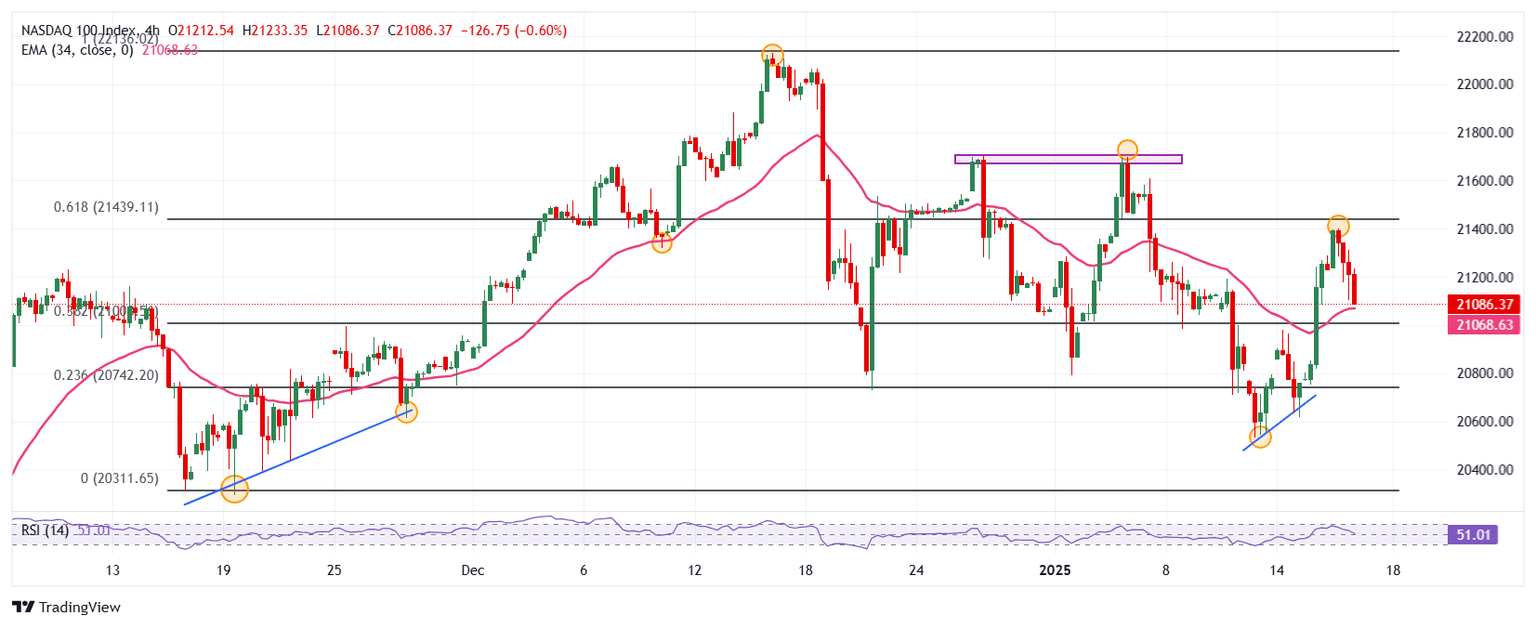 El Nasdaq 100 reaccionó a la baja desde máximos de más de una semana en 21.401, encontrando vendedores que llevaron el índice a un mínimo del día en 21.104. Al momento de escribir, el Nasdaq 100 cotiza en 21.086 perdiendo un 0.69% el día de hoy.