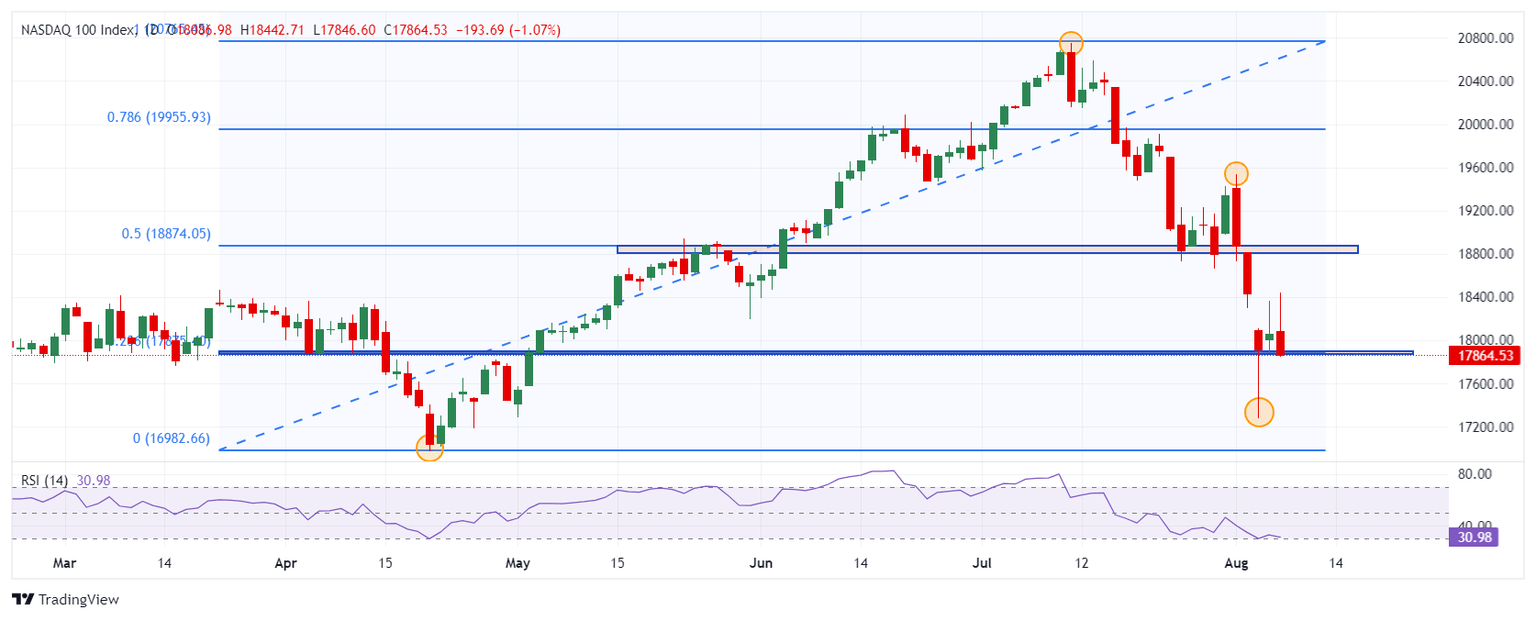El Nasdaq 100 marcó un máximo del día en 18.442 durante la sesión americana, atrayendo vendedores que llevaron el índice tecnológico a un mínimo diario en 17.846. Actualmente, el Nasdaq 100 opera en 17.864, perdiendo un 1.17% al cierre del mercado.