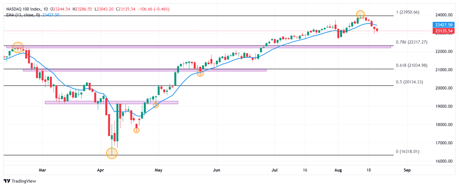 - El Nasdaq 100 retrocede un 0.46% el día de hoy, manteniéndose dentro del rango del 20 de agosto en 23.135.
