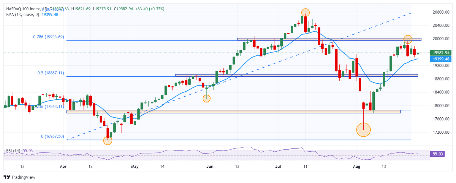 El Nasdaq 100 estableció un mínimo diario en 19.375, donde encontró compradores que llevaron el índice tecnológico a un máximo del día en 19.620. Al cierre del mercado, el Nasdaq 100 cotiza en 19.582, subiendo un 0.34% el día de hoy.