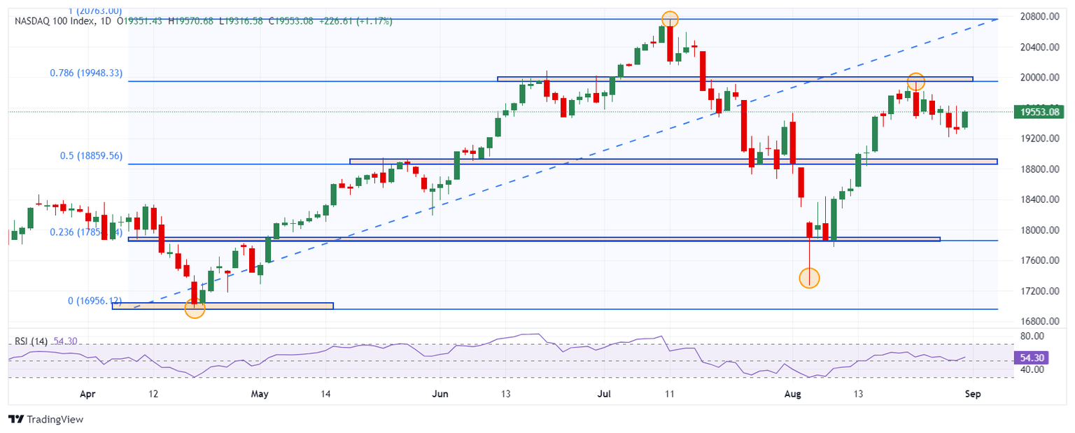 El Nasdaq 100 estableció un mínimo del día en 19.316, encontrando compradores que llevaron el índice a un máximo diario en 19.570. Actualmente, el Nasdaq 100 opera en 19.553, ganando un 1.17% en el día.