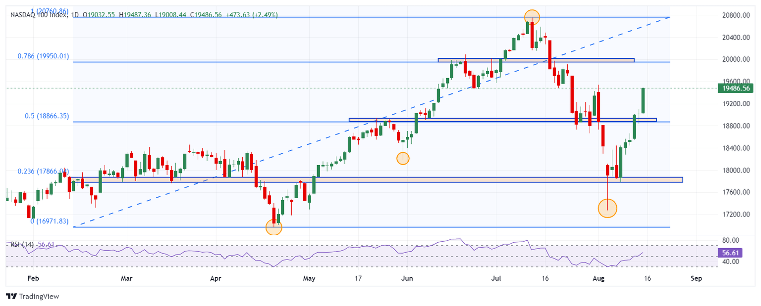 El Nasdaq 100 estableció un mínimo del día en 19.008, atrayendo compradores agresivos que llevaron el índice tecnológico a un máximo de dos semanas no visto desde el 1 de agosto en 19.475. Al momento de escribir, el Nasdaq 100 cotizo en 19.473 ganando un 2.43%