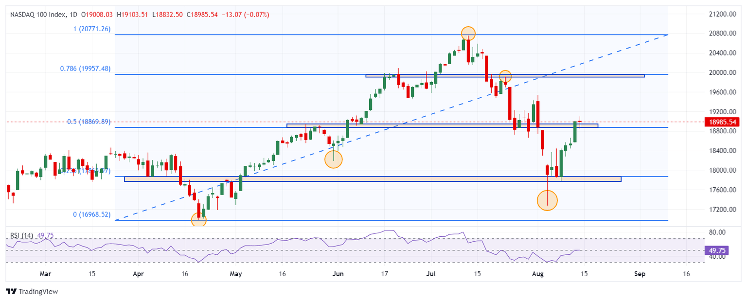 El Nasdaq 100 marcó un mínimo diario en 18832 atrayendo compradores que llevaron el índice alcanzar un máximo de un día en 19 103. Al momento de escribir, el Nasdaq 100 cotiza en 18.982, perdiendo un 0.12% el día de hoy.