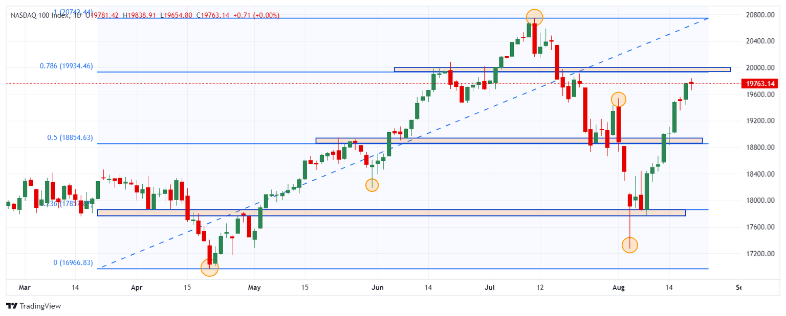 El Nasdaq 100 mantiene la tendencia alcista, formando un soporte en 18.832, dado por el mínimo del 14 de agosto. El siguiente soporte se encuentra en 17.775, punto pivote del 8 de agosto en confluencia con el retroceso al 23.6% de Fibonacci. La próxima la observamos en 19.971, máximo del 18 de julio.