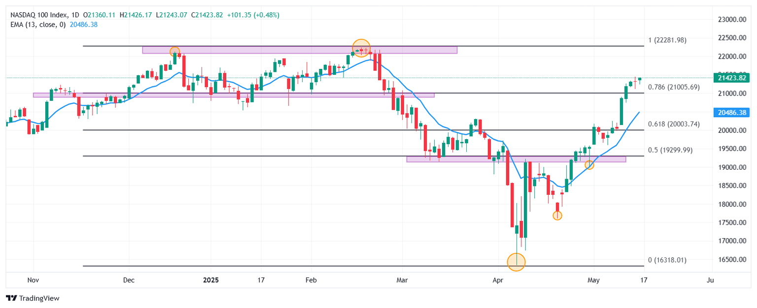 - El Nasdaq 100 repunta un 0.48% diario, alcanzando un máximo del día en 21.423.