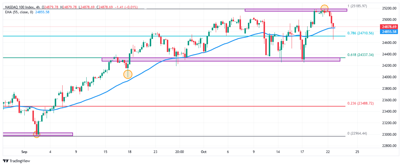 El Nasdaq 100 reaccionó a la baja desde un máximo diario en 25.179, atrayendo vendedores agresivos que arrastraron el índice a mínimos del 17 de octubre en 24.654. Actualmente, el Nasdaq 100 opera en 24.878, cayendo un 0.98%.