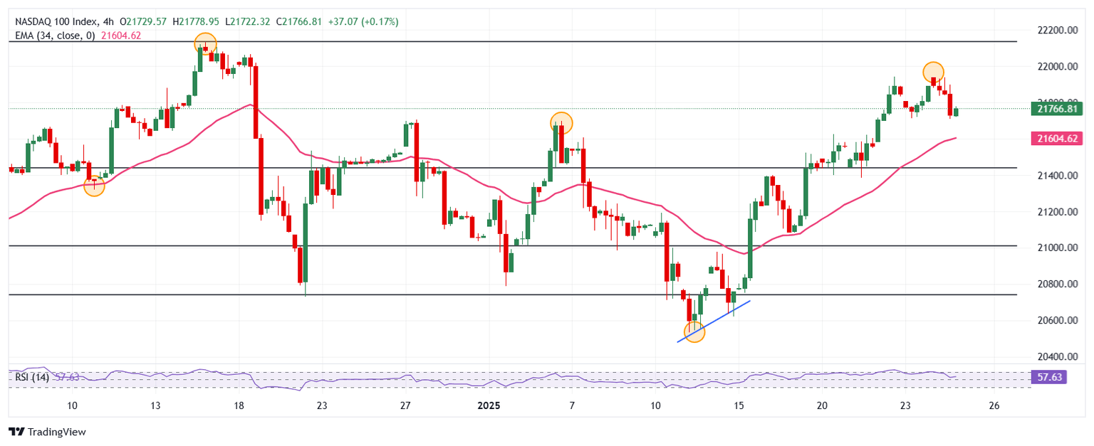 El Nasdaq 100 estableció un soporte de corto plazo dado por el mínimo del 21 de enero en 21.384. La siguiente zona clave de soporte está en 20.532, punto pivote del 13 de enero. La resistencia más cercana está en 21.940, máximo del 24 de enero.