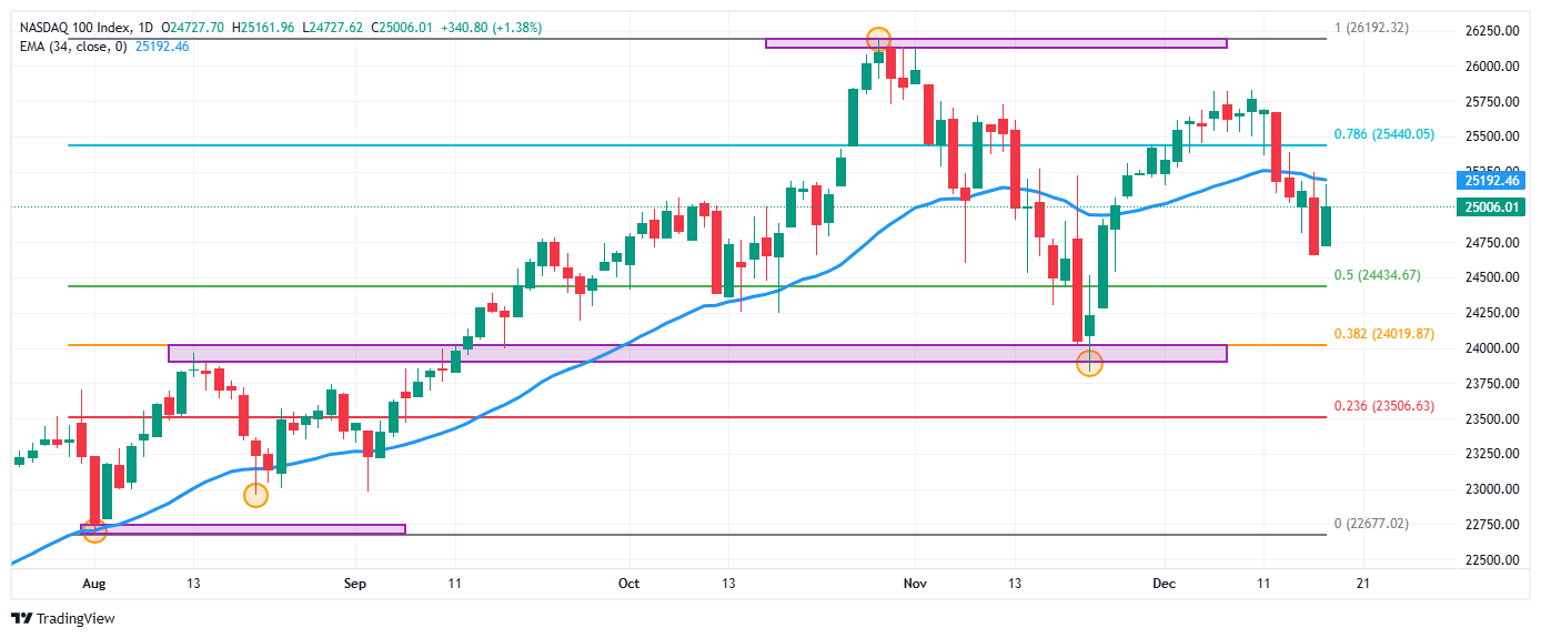 El Nasdaq 100 estableció un soporte de corto plazo dado por el mínimo del 21 de noviembre en 23.831 en convergencia con el retroceso al 38.2% de Fibonacci. El siguiente soporte clave está en 22.671, mínimo del 1 de agosto. Al norte, la resistencia más cercana está en 26.190, punto pivote del 29 de octubre.