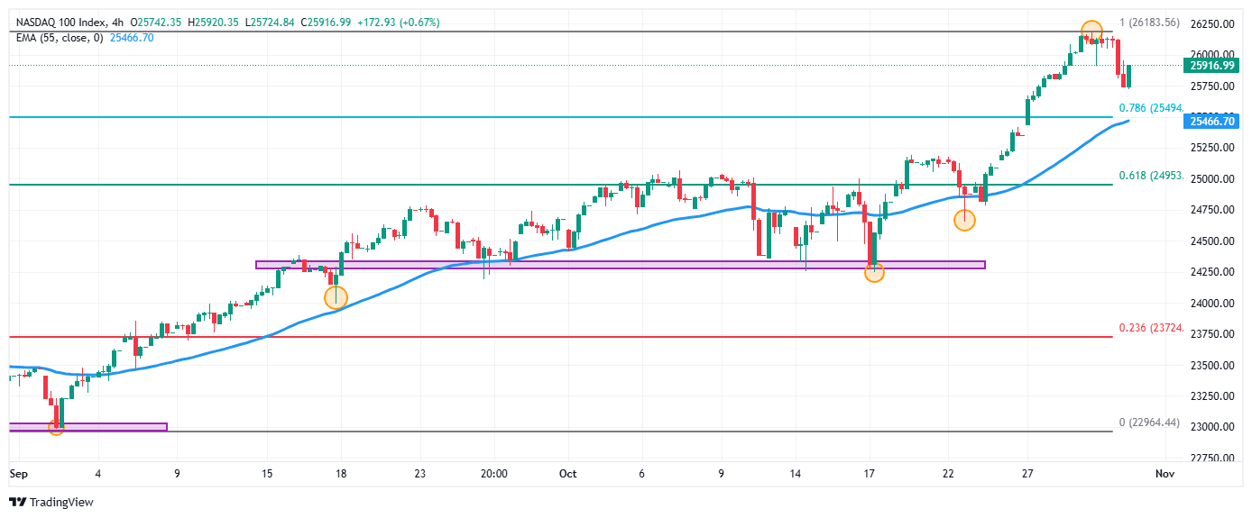 - El Nasdaq 100 retrocede un 0.69% en la cuarta jornada de la semana, visitando mínimos del 27 de octubre en 25724.