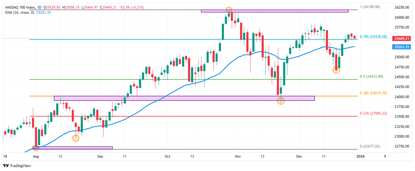 El Nasdaq 100 estableció un máximo diario en 25.558, atrayendo vendedores que arrastraron el índice a un mínimo del día en 25.464. Actualmente, el Nasdaq 100 cotiza sobre 25.469, perdiendo un 0.19% diario.