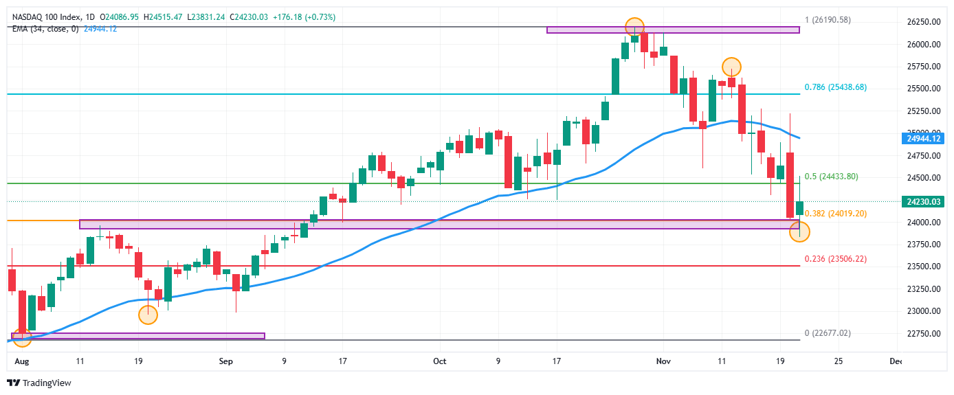 En este escenario, el Nasdaq 100 sube 176 puntos, operando actualmente en 24.230.