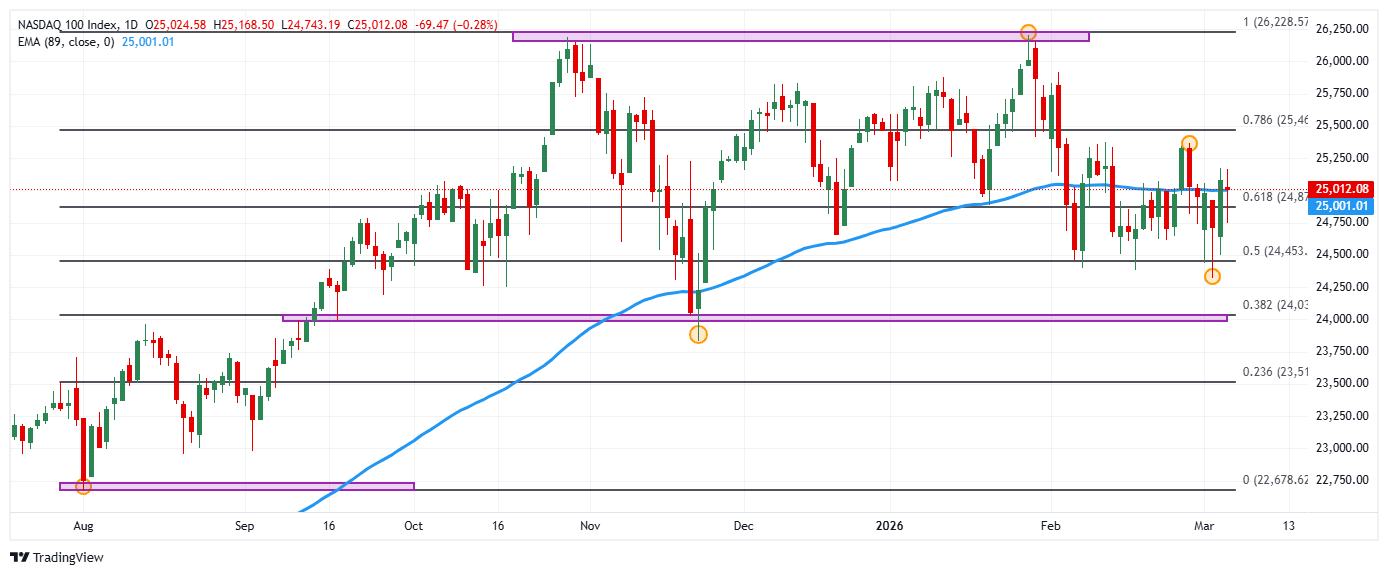 - El Nasdaq 100 pierde un 0.28% en el día, concluyendo la sesión en 25.012.