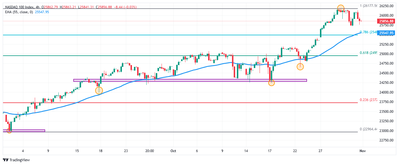 - El Nasdaq 100 presentó una caída de un 0.23% diario, manteniéndose dentro del rango operativo del 30 de octubre en 25.856.