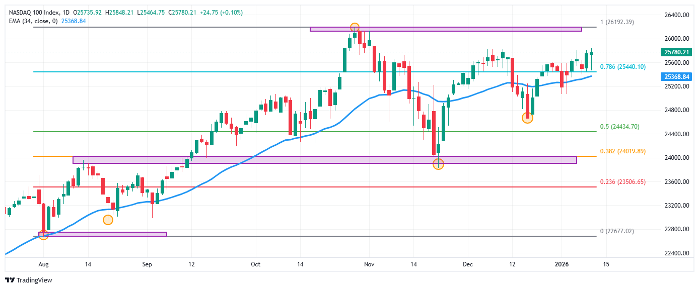 El Nasdaq 100 marcó un mínimo diario en 25.644, donde encontró compradores agresivos que llevaron el índice a máximos no vistos desde el 4 de noviembre de 2025 en 25.848. En estos momentos, el Nasdaq 100 cotiza en 25.793, ganando un 0.15% en la jornada del lunes.