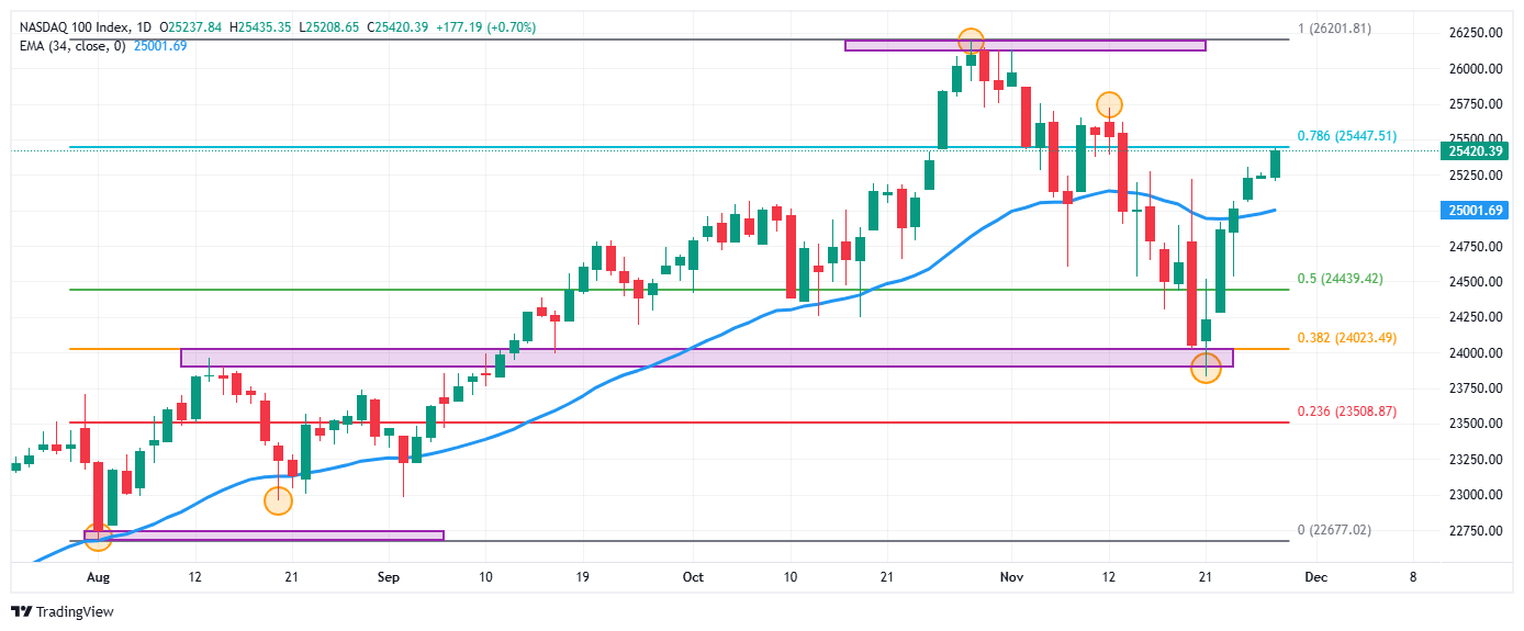 El Nasdaq 100 estableció un mínimo diario en 25.208 donde atrajo compradores que llevaron el índice a máximos del 13 de noviembre en 25.435.