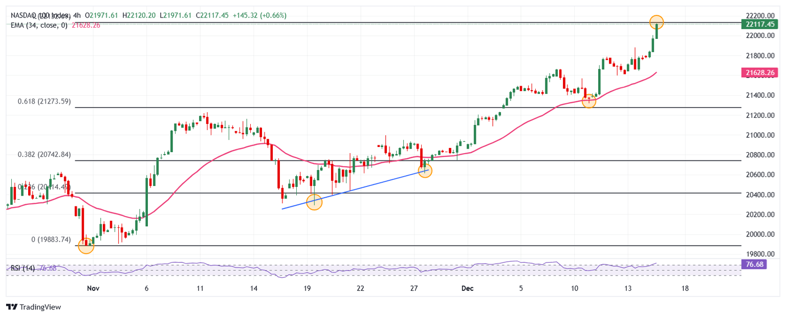 El índice tecnológico Nasdaq 100 gana un 1.60% el día de hoy, alcanzando un nuevo máximo histórico en 22.120.